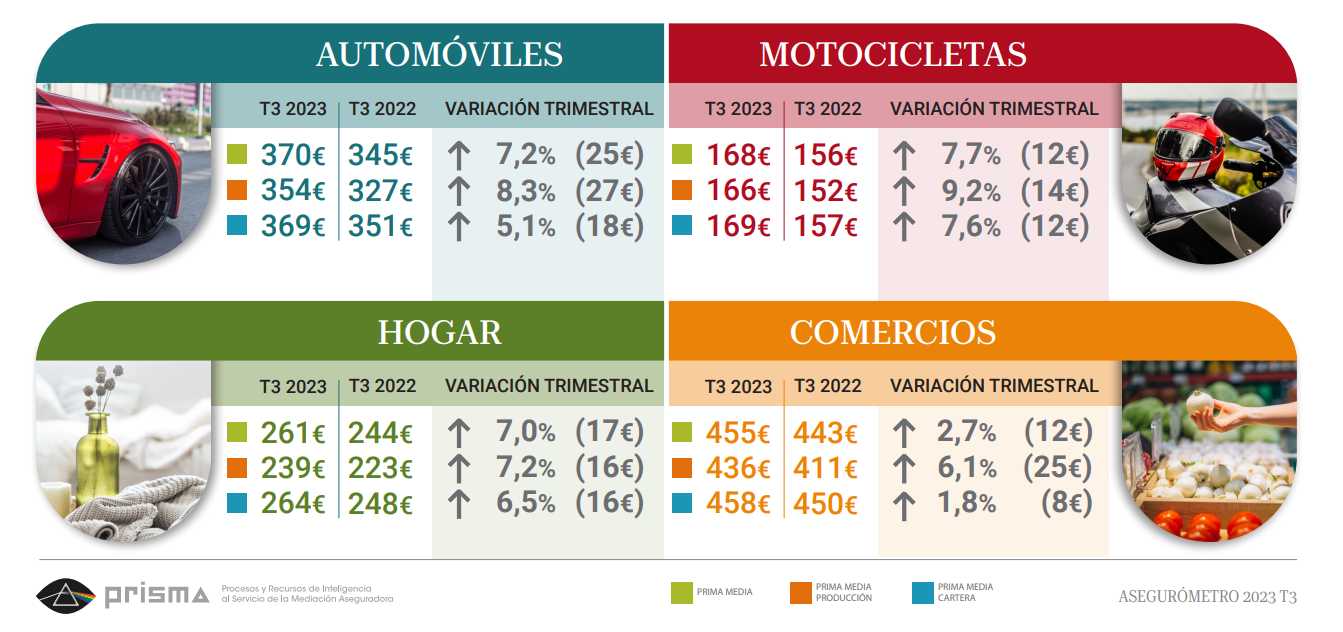 Prisma concluye el análisis señalando que los precios medios del seguro “han experimentado una subida progresiva a lo largo del 2023 en todos los ramos analizados“. Apunta que se confirma así en lo que llevamos de año subidas de primas medias entre el 2,7% de Comercios y hasta el 7,7% en Motocicletas.