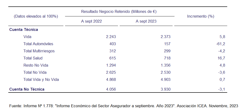 El total de Vida y No Vida del sector asegurador español ha cerrado septiembre con un resultado de 4.903 millones, ligeramente superior a los 4.868 millones y un aumento del 0,7%.