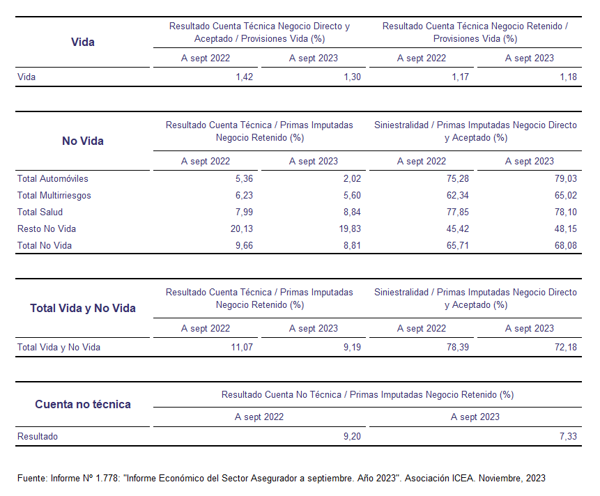 El ‘Informe Económico del Sector Asegurador a septiembre. Año 2023‘ que ha dado a conocer ICEA muestra una realidad del mercado de seguros español que se contrapone a los buenos datos en primas conocidos recientemente. Lo cierto es que la parte aseguradora, la cuenta técnica, ve cómo Vida mejora su resultado, mientras que No Vida queda lastrada por el negocio de Automóvil con un nuevo repunte en la siniestralidad hasta septiembre.